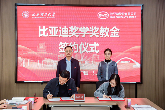 随后,双方代表签署捐赠协议,相互颁发捐赠证书和捐赠牌匾。比亚迪在我校设立“太原理工大学比亚迪奖学奖教金”,用于表彰优秀学生及教工。