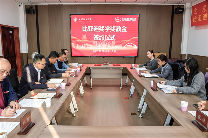 12月10日,太原理工大学比亚迪奖学奖教金捐赠签约仪式在迎西校区举行。比亚迪股份公司(以下简称:“比亚迪”)人力资源处国内地区四部总监陈静、人力资源处国内地区四部招聘经理罗雪、人力资源处国内地区四部太原人事经理卫雅、集团人力资源处国内地区四部校招主管倪婷,招生与就业工作部部长李栩、国内合作办公室副主任李飞及招生与就业工作部相关部门负责人出席仪式。会议由招生与就业工作部副部长高长春主持。