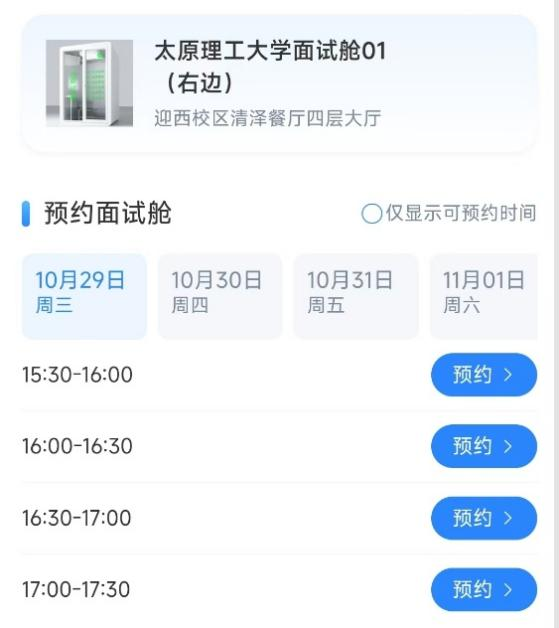 登录后点击首页的【预约面试舱】按钮,进入预约界面。选择您需要的日期与空闲时段,确认提交后,即代表预约成功!